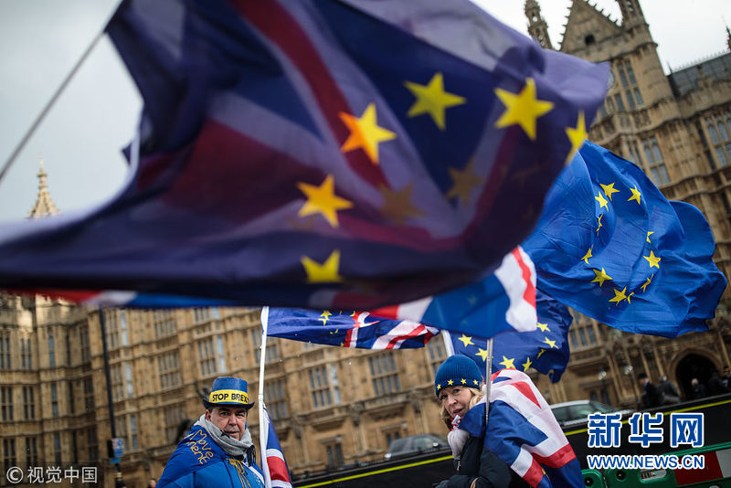 2月26日,英國倫敦,示威者在議會大廈外抗議“脫歐”。(圖片來源:視覺中國)