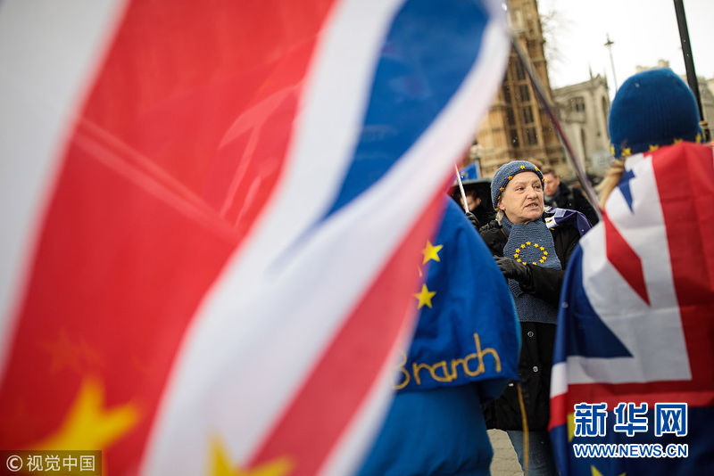 2月26日,英國(guó)倫敦,示威者在議會(huì)大廈外抗議“脫歐”。(圖片來(lái)源:視覺中國(guó))