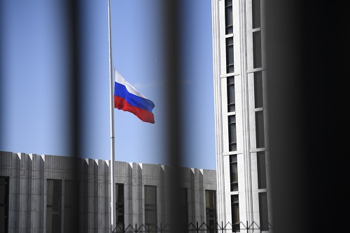 這是3月26日在美國首都華盛頓拍攝的俄羅斯駐美國大使館內(nèi)的俄羅斯國旗。新華社記者楊承霖攝