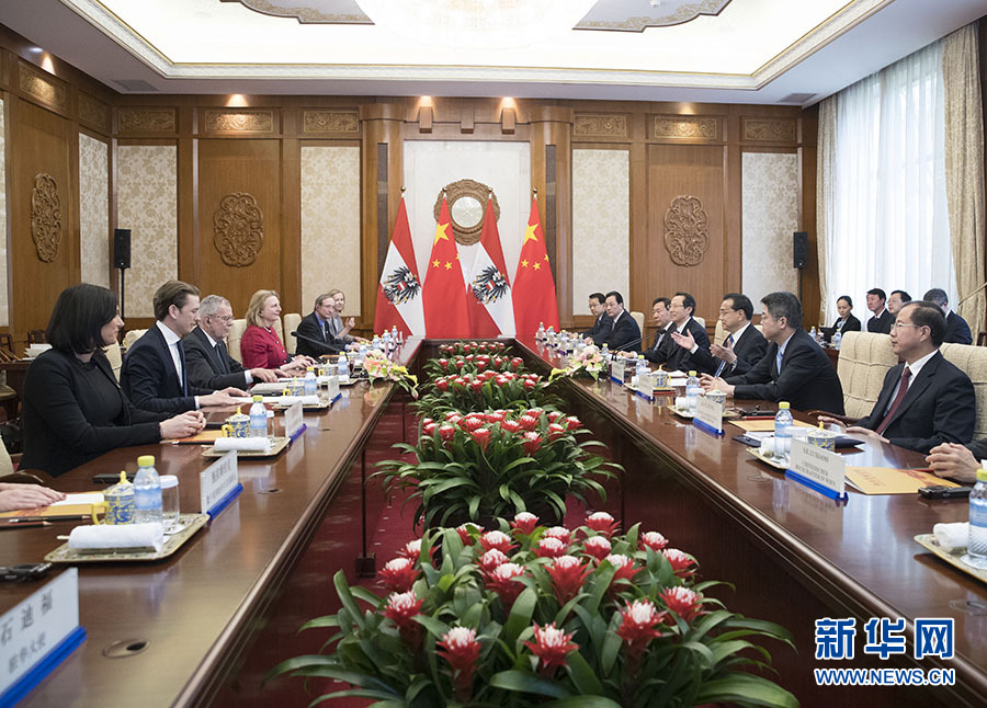 李克強(qiáng)歡迎范德貝倫總統(tǒng)和庫爾茨總理聯(lián)袂訪華。他表示,奧地利是中國在歐洲的重要伙伴。習(xí)近平主席同總統(tǒng)先生舉行會(huì)談,共同規(guī)劃兩國關(guān)系未來發(fā)展。中方愿同奧方抓住機(jī)遇,對接發(fā)展戰(zhàn)略,深化人文交流合作,加強(qiáng)在國際事務(wù)中的溝通協(xié)調(diào),全面提升兩國關(guān)系水平。