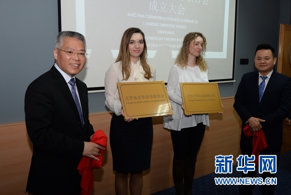 4月11日,中國駐克羅地亞大使胡兆明(左一)與克羅地亞華語導(dǎo)游協(xié)會會長蔣曉亮(右一)在薩格勒布為當(dāng)天成立的克羅地亞華語導(dǎo)游協(xié)會和巴爾干華人旅游協(xié)會揭牌。新華社記者高磊 攝