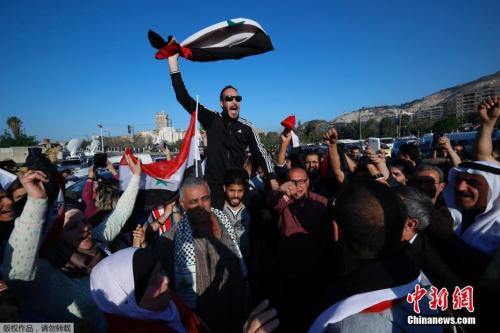 當(dāng)?shù)貢r間4月14日,敘利亞首都大馬士革民眾在街頭發(fā)起示威游行,抗議美國聯(lián)合英法兩國對首都大馬士革發(fā)起空襲行動。