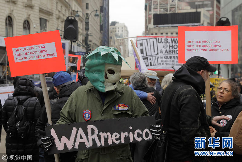 4月15日,美國(guó)紐約,民眾舉行反戰(zhàn)游行,抗議美英法聯(lián)軍襲擊敘利亞。(圖片來(lái)源:視覺中國(guó))