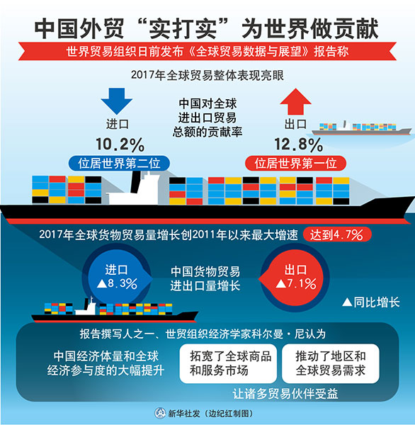 世界貿易組織日前發(fā)布《全球貿易數據與展望》報告稱,2017年全球貿易整體表現亮眼,中國對全球進出口貿易總額的貢獻率高達10.2%和12.8%,分別位居世界第二和第一位。這再次表明,作為世界第一大貨物貿易國,中國已成為拉動全球貿易巨輪前行的重要推動力。