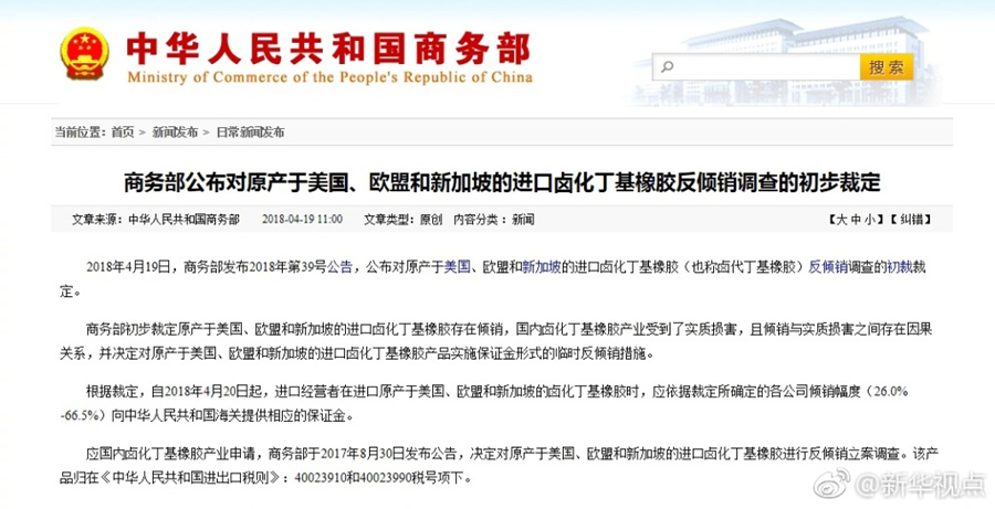 新華網(wǎng)北京4月19日電 商務部今天發(fā)布公告,初步裁定原產(chǎn)于美國、歐盟和新加坡的進口鹵化丁基橡膠存在傾銷。根據(jù)裁定,自2018年4月20日起,進口經(jīng)營者在進口原產(chǎn)于美國、歐盟和新加坡的鹵化丁基橡膠時,應依據(jù)裁定所確定的各公司傾銷幅度(26.0%-66.5%)向中華人民共和國海關(guān)提供相應的保證金。?(據(jù)新華社“新華視點”微博報道)