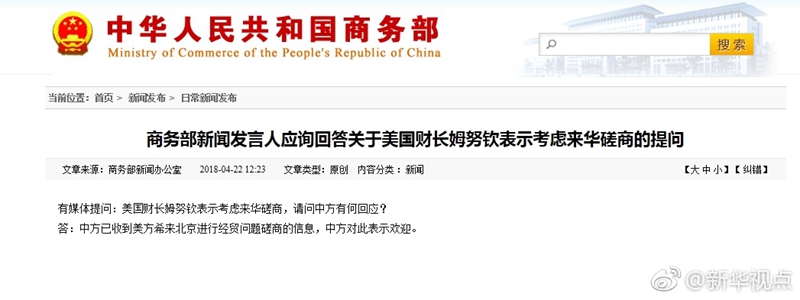 新華網(wǎng)北京4月22日電? 商務(wù)部網(wǎng)站消息,有媒體提問(wèn):美國(guó)財(cái)長(zhǎng)姆努欽表示考慮來(lái)華磋商,請(qǐng)問(wèn)中方有何回應(yīng)?答:中方已收到美方希來(lái)北京進(jìn)行經(jīng)貿(mào)問(wèn)題磋商的信息,中方對(duì)此表示歡迎。 ????(據(jù)新華社“新華視點(diǎn)”微博報(bào)道)
