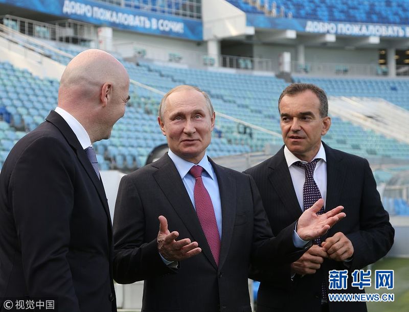 5月3日,俄羅斯索契,俄羅斯總統(tǒng)普京與國際足聯(lián)主席因凡蒂諾參觀菲什特奧林匹克體育場。(圖片來源:視覺中國)