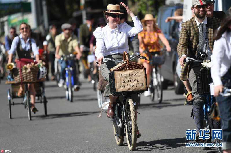 當(dāng)?shù)貢r(shí)間2018年5月5日,英國倫敦,當(dāng)?shù)嘏e辦復(fù)古騎行活動(dòng),民眾身穿花呢子服裝騎車穿行在倫敦街頭。今年是該活動(dòng)舉辦十周年。(圖片來源:東方IC)
