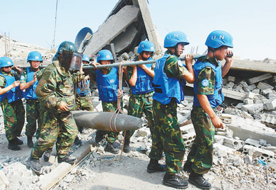 中國(guó)維和部隊(duì)官兵在黎巴嫩南部轉(zhuǎn)移未爆航彈。資料照片(新華社發(fā))
