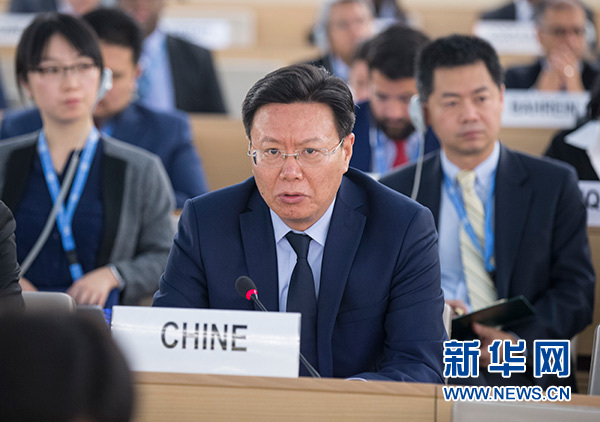 5月18日,在瑞士日內(nèi)瓦萬國宮,中國常駐聯(lián)合國日內(nèi)瓦辦事處和瑞士其他國際組織代表俞建華(中)出席聯(lián)合國人權理事會加沙局勢特別會議。新華社記者 徐金泉 攝
