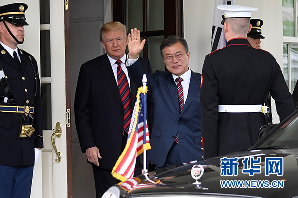 5月22日,美國總統(tǒng)特朗普(左二)在華盛頓白宮歡迎到訪的韓國總統(tǒng)文在寅(左三)。 新華社記者楊承霖?cái)z