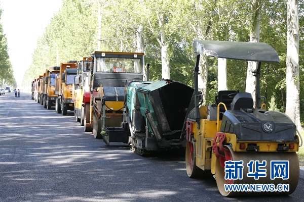 比什凱克和平大街上剛剛鋪好的瀝青路面和施工車。新華網(wǎng)發(fā)