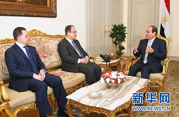 6月14日,在埃及首都開羅,埃及總統(tǒng)塞西(右一)和本屆內(nèi)閣新當(dāng)選成員內(nèi)政部長(zhǎng)馬哈茂德·陶菲克(左一)、前任內(nèi)政部長(zhǎng)阿卜杜勒·加法爾(左二)交談。新華社/中東社