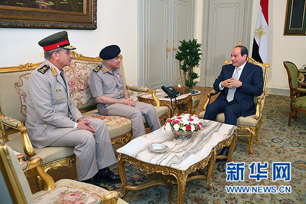 6月14日,在埃及首都開羅,埃及總統(tǒng)塞西(右一)和本屆內(nèi)閣新當(dāng)選成員國(guó)防部長(zhǎng)穆罕默德·扎基(左一)和前任國(guó)防部長(zhǎng)西德基·蘇卜希(左二)交談。新華社/中東社