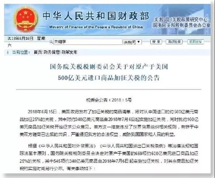6月15日,美國政府不顧中美雙方達(dá)成的共識,發(fā)布對價值500億美元中國商品加征25%關(guān)稅的商品清單,嚴(yán)重侵犯和損害中國和中國人民的合法權(quán)益。隨后,中方依據(jù)相關(guān)法律發(fā)布公告,對原產(chǎn)于美國的659項約500億美元進(jìn)口商品加征25%的關(guān)稅。2018-06-16 13:07:18