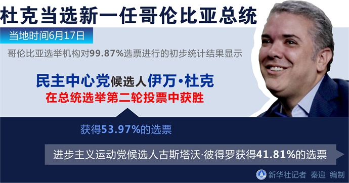 新華社波哥大6月17日電(記者何珊)哥倫比亞總統(tǒng)選舉第二輪投票17日在平靜中結(jié)束。右翼候選人杜克戰(zhàn)勝左翼候選人彼得羅,當(dāng)選哥倫比亞新一任總統(tǒng)。杜克將于8月7日宣誓就職,任期至2022年。