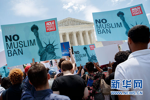 6月26日,在美國首都華盛頓,人們在聯(lián)邦最高法院前抗議。美國聯(lián)邦最高法院26日裁定,總統(tǒng)特朗普去年頒布的移民限制令“完全符合”總統(tǒng)職權(quán)范圍。新華社發(fā)(沈霆 攝)