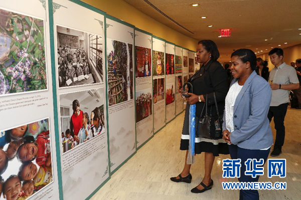 6月28日,在位于紐約的聯(lián)合國(guó)總部,人們觀看“追尋美好生活”中國(guó)脫貧成就展。 新華社記者李木子攝