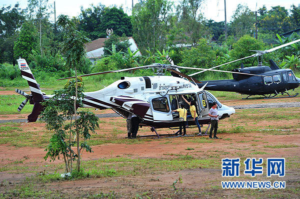 7月9日,在泰國清萊,直升機(jī)在山洞附近待命。新華社發(fā)(拉亨 攝)