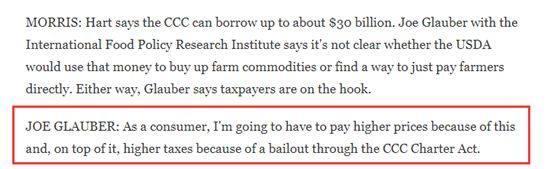 比如,一位美國(guó)愛(ài)荷華州立大學(xué)的學(xué)者就表示,單純?cè)黾愚r(nóng)業(yè)補(bǔ)貼根本無(wú)法在貿(mào)易戰(zhàn)這樣的沖突中保護(hù)農(nóng)民的權(quán)益。而另一位美國(guó)食品領(lǐng)域的學(xué)者則表示,即便特朗普政府會(huì)出面直接收購(gòu)農(nóng)民的產(chǎn)品,這些收購(gòu)的錢(qián)款還不是得從消費(fèi)者——即納稅人——的口袋里出?
