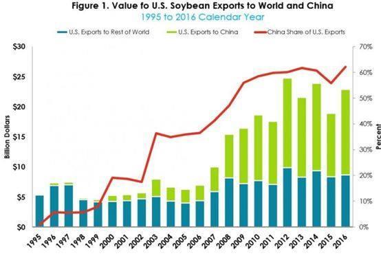 ▲圖為美國(guó)從1995年到2016年出口給全世界和中國(guó)的大豆情況,可以看到中國(guó)是美國(guó)大豆產(chǎn)業(yè)中最大且無(wú)法替代的市場(chǎng)