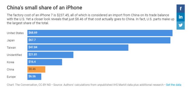 而這,便會令人以為美國在這個(gè)蘋果手機(jī)的貿(mào)易上對中國損失了240美元。那么如此計(jì)算的話,去年一年美國僅在iPhone7和iPhone7 Plus這兩款蘋果手機(jī)上就與中國有了157億美元的“貿(mào)易逆差”。
