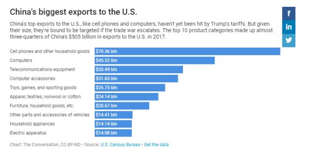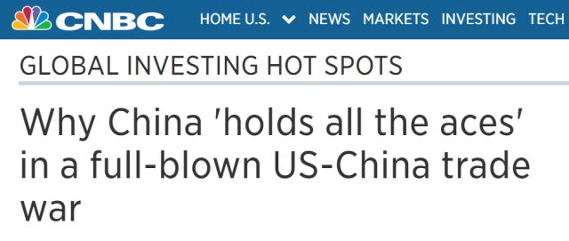 因此,CNBC這篇文章的作者也得出了與“布魯金斯學(xué)會”一樣的結(jié)論,即特朗普現(xiàn)在對中國的打擊只會傷及自身和盟友。這位作者甚至也列舉了CBS新聞網(wǎng)今天提到的那個(gè)iPhone手機(jī)的例子,并認(rèn)為一旦中美貿(mào)易戰(zhàn)“全面爆發(fā)”,中國手上可打的“王牌”要比美國多。