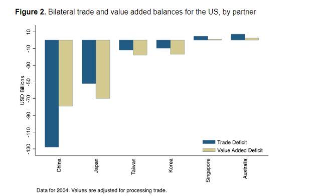 這家美國智庫的觀點(diǎn),也得到了來自歐洲的智庫“經(jīng)濟(jì)政策研究中心”2011年一篇報(bào)告的佐證。報(bào)告中的數(shù)據(jù)就顯示,如果貿(mào)易逆差是按照各個(gè)國家在產(chǎn)品中實(shí)際的“附加價(jià)值”計(jì)算的話,那么中美的貿(mào)易逆差將會大大縮減40%甚至更多。
