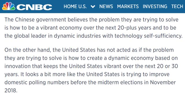 特朗普真正在意的問題,并不是創(chuàng)造一個(gè)活躍創(chuàng)新的經(jīng)濟(jì),好讓美國在未來20-30年繼續(xù)保持領(lǐng)先,他在乎的只是11月中期選舉的投票數(shù)字;另一方面,中國政府在意的問題,反倒是如何令其經(jīng)濟(jì)在接下來的20年里保持活力,從而令中國成為一個(gè)引領(lǐng)世界、科技上自主獨(dú)立的國家。