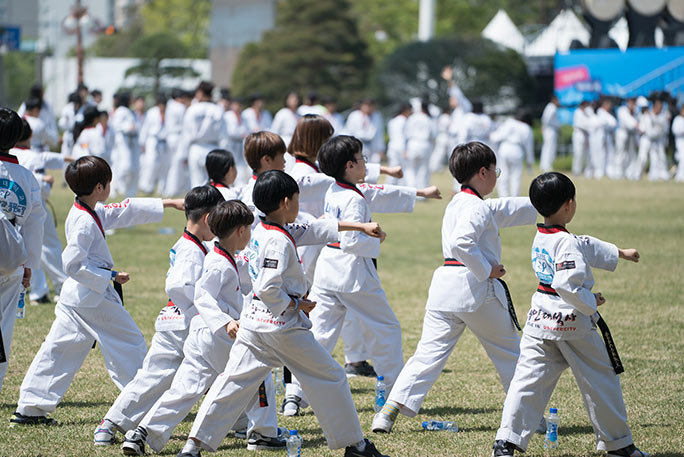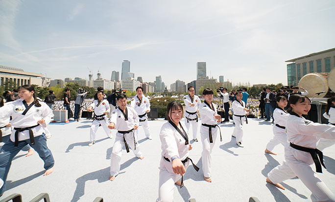 參加本次活動的既有年輕人,也有老年人。整個表演經(jīng)過精心編排,持續(xù)了10分鐘時間,所有參與者在表演中都穿著傳統(tǒng)的跆拳道服。