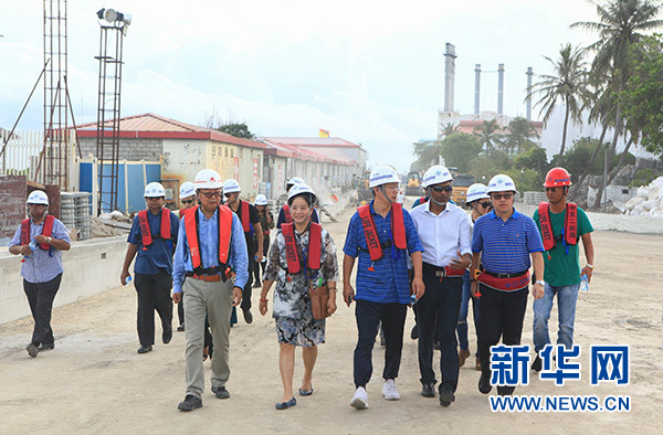 7月11日,在馬爾代夫首都馬累,馬爾代夫住房和基建部長穆伊祖(前右二)在中馬友誼大橋建設(shè)現(xiàn)場參觀。新華社發(fā)(王明亮攝)