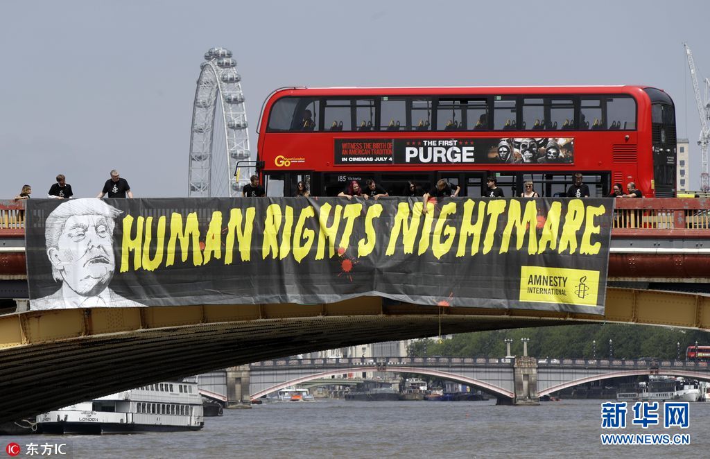 7月12日,英國(guó)倫敦,國(guó)際特赦組織成員在倫敦泰晤士河上沃克斯豪爾橋懸掛橫幅,抗議美國(guó)總統(tǒng)特朗普到訪英國(guó)。(圖片來源:東方IC)