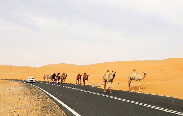 阿聯(lián)酋利瓦沙漠公路上的駝隊。新華社記者 李震攝