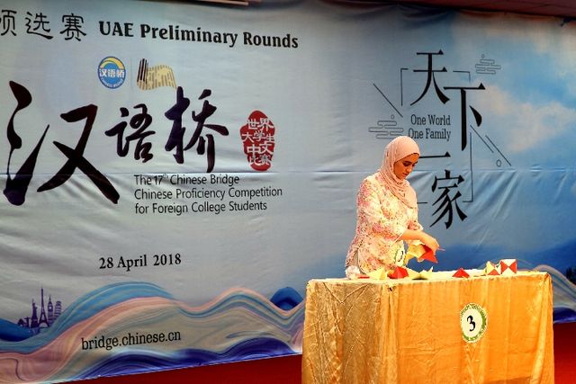 2018年4月28日, 第17屆“漢語橋”世界大學生中文比賽阿聯(lián)酋賽區(qū)預選賽上,扎耶德大學18歲的大一女生獲得冠軍。新華社記者 蘇小坡攝