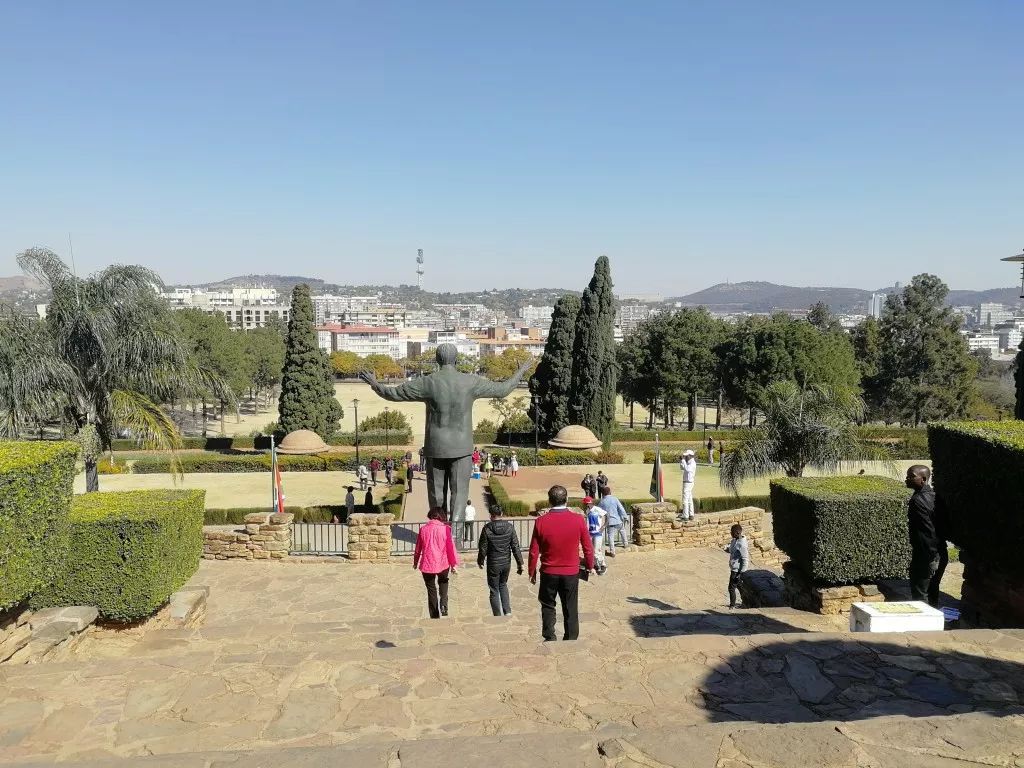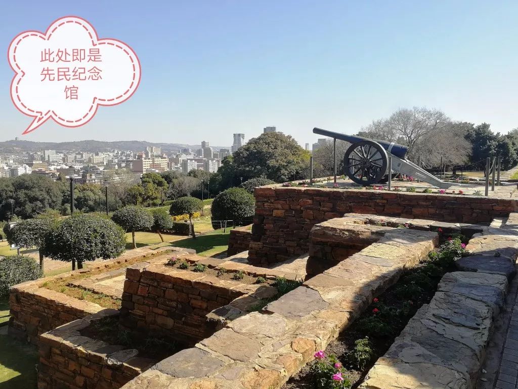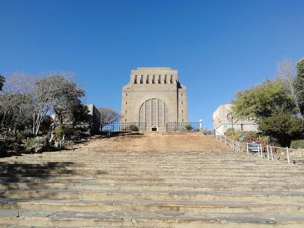 站在聯(lián)邦大廈前,可以從山坡上俯瞰比勒陀利亞全城。對(duì)面山坡上方形建筑,就是南非著名的先民紀(jì)念館(Voortrekker Monument)。