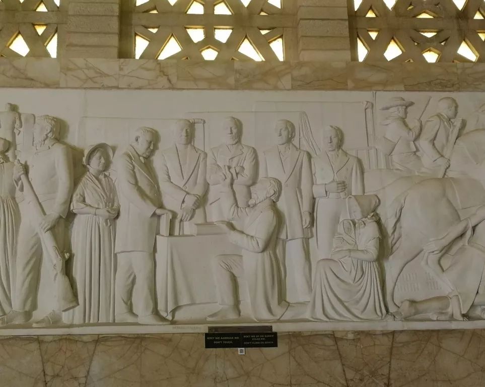 在紀(jì)念館大堂里的巨大拱形窗下,27幅浮雕詳細(xì)講述了當(dāng)年(1835-1852)荷裔布爾人大遷徙的歷史。每幅浮雕下面,都有一個(gè)二維碼。
