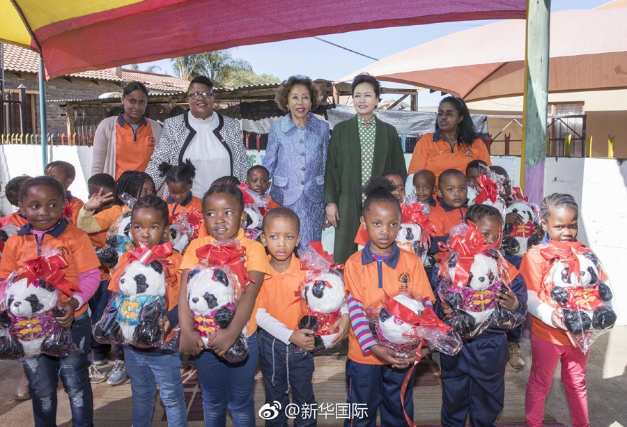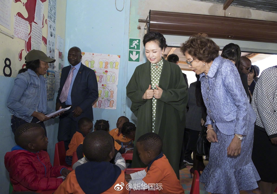 彭麗媛和莫采佩抵達時,非洲自助基金會負責(zé)人、托兒所園長等在門口迎接。40名活潑可愛的南非兒童揮舞中南兩國國旗列隊歡迎,彭麗媛俯身同孩子們親切握手問候。彭麗媛來到庭院,20多名兒童手持兩國國旗,輪流用中英文高聲呼喊“歡迎歡迎”。孩子們伴著俏皮輕快的舞蹈動作,合唱英文歌曲《歡迎您》、用中文吟唱中國古詩兒歌《詠鵝》、演唱南非說唱歌曲。彭麗媛認(rèn)真聆聽,頻頻點頭微笑、不時鼓掌稱贊,夸獎孩子們中文發(fā)音準(zhǔn)確。彭麗媛來到教室,觀看兒童繪畫、識字,和孩子們用當(dāng)?shù)貍鹘y(tǒng)手語互致問候。彭麗媛向孩子們贈送玩具、文具、圖書,并在孩子們自己創(chuàng)作的手印畫上題寫“前程似錦”,勉勵孩子們好好學(xué)習(xí)、茁壯成長。彭麗媛表示,兒童成長關(guān)乎一個國家未來。兒童早期教育,最重要的是樹德育人,引導(dǎo)他們樹立遠大志向、培育美好心靈。希望中南友好事業(yè)從娃娃抓起,讓他們長大后做兩國友好事業(yè)的傳承者和接班人。