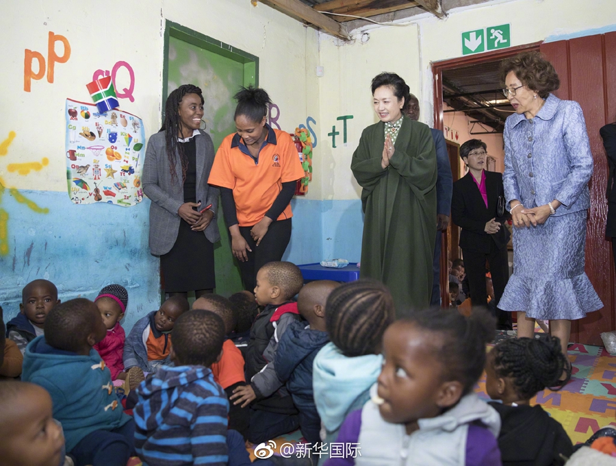 當(dāng)?shù)貢r間7月24日上午,國家主席習(xí)近平夫人、聯(lián)合國教科文組織促進女童和婦女教育特使彭麗媛在南非總統(tǒng)夫人莫采佩陪同下,參觀位于比勒陀利亞東郊的烏坦多社區(qū)托兒所。 新華社記者 王曄 攝