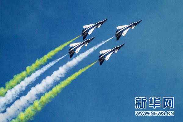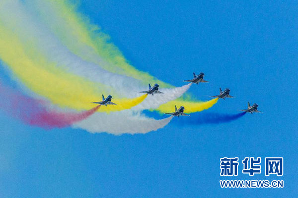 蔚藍的天空下,八一飛行表演隊成功上演了六機向下開花、五機水平向上開花、四機編隊橫滾、單機蛇行扭轉等21個高難度飛行動作,贏得了現(xiàn)場觀眾陣陣掌聲。