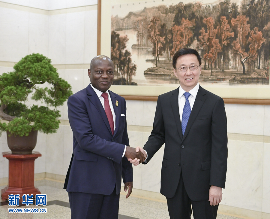 9月5日,中共中央政治局常委、國務院副總理韓正在北京釣魚臺國賓館會見幾內(nèi)亞比紹總統(tǒng)瓦斯。新華社記者 高潔 攝