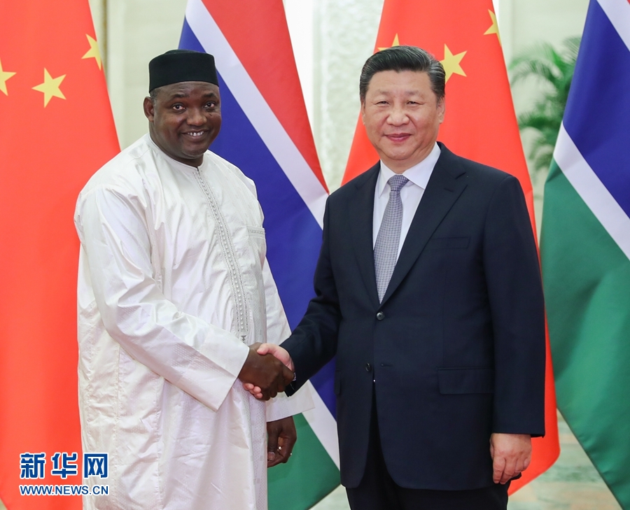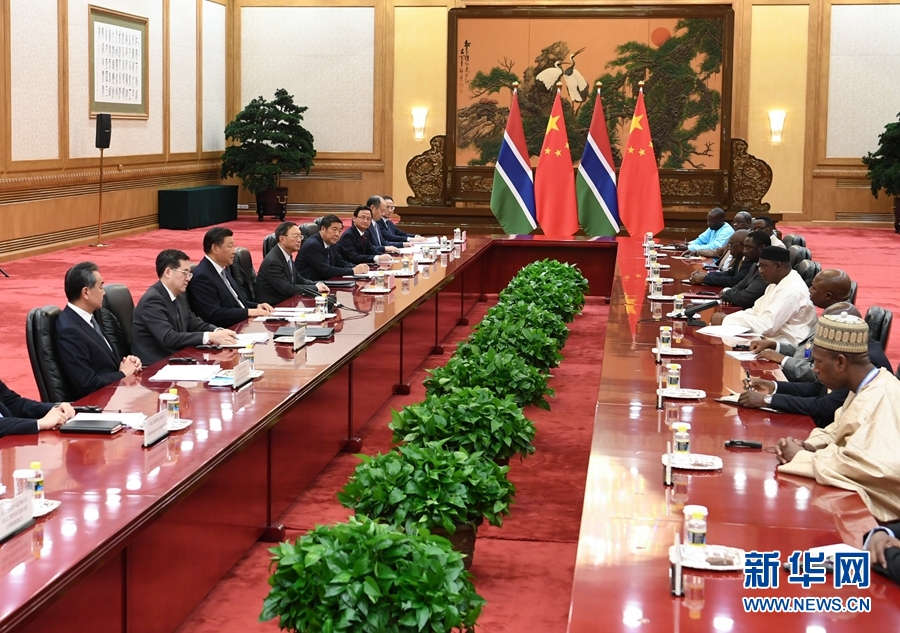 習(xí)近平歡迎岡比亞總統(tǒng)首次出席中非合作論壇會議,指出這對中岡關(guān)系、中非關(guān)系、論壇建設(shè)均具有重要意義。習(xí)近平強調(diào),中岡復(fù)交2年多來,雙方友好合作全面、順利推進,雙邊關(guān)系發(fā)展得很好、很快,中方對兩國關(guān)系發(fā)展取得的成果感到滿意。中方贊賞總統(tǒng)先生和岡比亞政府堅持一個中國原則,愿同岡方繼續(xù)把握好兩國關(guān)系的大方向,不斷增進政治互信,繼續(xù)在涉及彼此核心利益和重大關(guān)切問題上相互堅定支持。中方支持岡比亞政府“建設(shè)新岡比亞”的努力,愿加強務(wù)實合作,擴大人文交流。中方支持岡方加強和平安全能力建設(shè)。