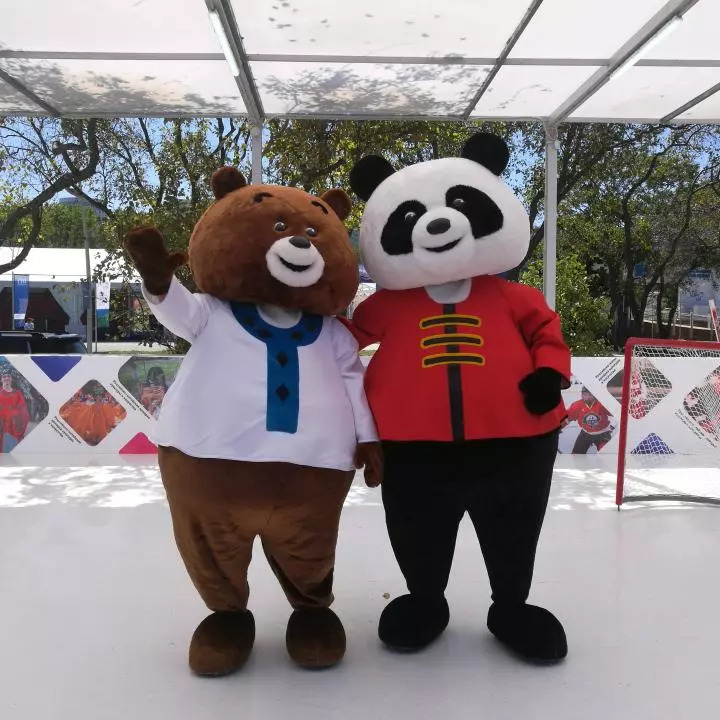 第四屆東方經(jīng)濟論壇配套展示項目遠東風采街上,可愛的“中國熊貓”和“俄羅斯棕熊”一起打冰球(新華社記者蔣國鵬攝)