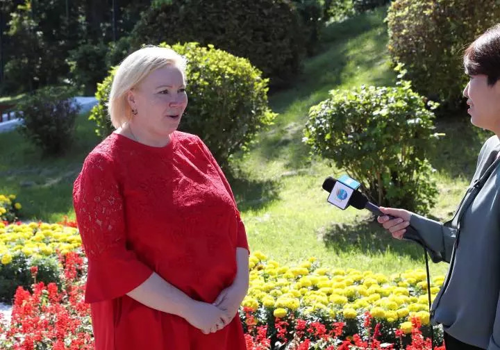 勘察加邊疆區(qū)旅游和對外聯(lián)絡局局長葉連娜·斯特拉托諾娃接受新華社記者采訪(新華社記者李建敏攝)
