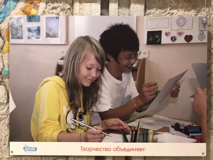 “海洋”全俄兒童中心展示的中國孩子和俄羅斯孩子一起上課的照片(新華社記者孟娜攝)
