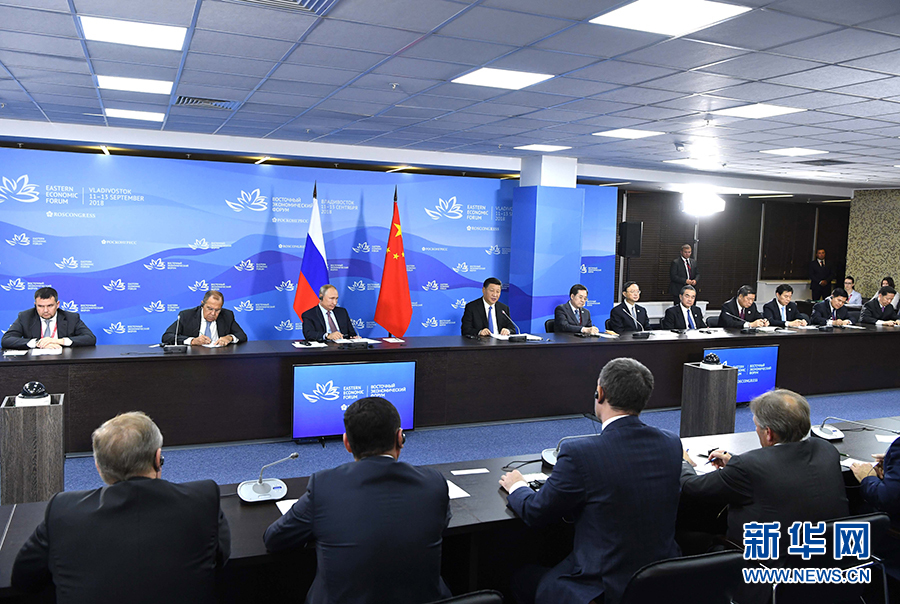 9月11日,國(guó)家主席習(xí)近平在符拉迪沃斯托克和俄羅斯總統(tǒng)普京共同出席中俄地方領(lǐng)導(dǎo)人對(duì)話會(huì)。 新華社記者 饒愛(ài)民 攝