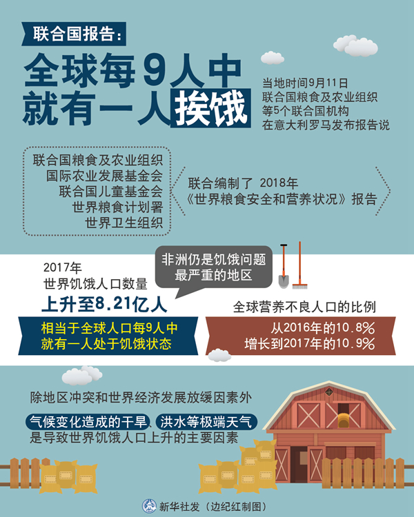 聯(lián)合國報告:全球每9人中就有一人挨餓。新華社發(fā) 邊紀紅 制圖