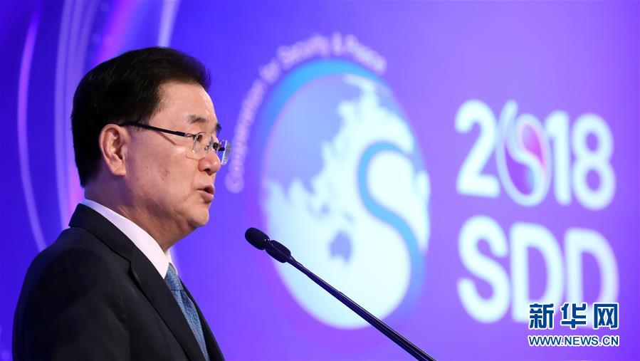 9月13日,在韓國首爾,韓國總統(tǒng)府青瓦臺國家安保室室長鄭義溶在“2018年首爾安保對話”開幕式上致辭。韓國總統(tǒng)府青瓦臺國家安保室室長鄭義溶13日表示,為從根本上消除可能導(dǎo)致韓朝雙方軍事沖突的危險因素,提升軍事互信水平,韓朝正就在軍事領(lǐng)域開展廣泛合作進行協(xié)商并制定方案。 新華社/紐西斯通訊社