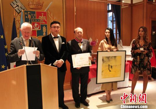 9月21日晚,中國(guó)工筆畫(huà)家崔景哲(左)在巴黎榮獲全球公益聯(lián)盟文學(xué)(藝術(shù))金質(zhì)勛章,也是此次頒獎(jiǎng)典禮所有獲獎(jiǎng)?wù)咧形ㄒ灰晃恢袊?guó)人。江蘇凱旋體育文化董事長(zhǎng)吳愛(ài)華等知名人士對(duì)崔景哲的獲獎(jiǎng)表示祝賀。李洋 攝