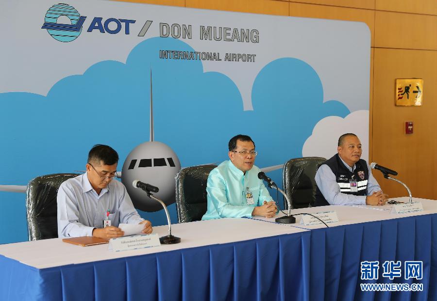 9月29日,在泰國曼谷廊曼機(jī)場,機(jī)場管理局局長素提拉瓦(中)在發(fā)布會上發(fā)言。 新華社記者張可任攝
