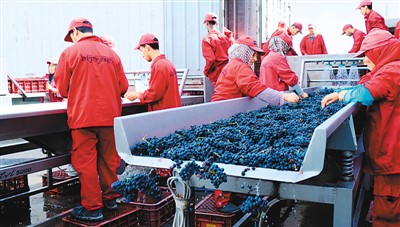 圖為摩洛哥一家酒莊的工人對(duì)葡萄進(jìn)行清洗加工準(zhǔn)備釀酒。葡萄酒將借首屆國(guó)際進(jìn)博會(huì)來到中國(guó)。新華社記者 陳斌杰攝